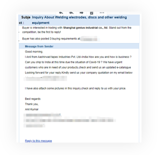 3采购商在B2B平台寻找到合适产品后,对供应商预留邮箱发出询盘!